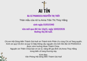 Cầu NguyệnSự Kiện Ai Tín của Thân Mẫu Nữ Tu Anna Trần Thị Thúy Hằng – Hd. MTG. Huế 10/02/202610/02/2026 Chia sẻ mục này: Facebook Linkedin Pinterest Gmail