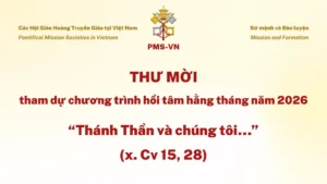 Để hỗ trợ cho tiến trình Đào luyện Môn đệ Thừa sai, những năm vừa qua, văn phòng Quốc gia các Hội Giáo hoàng Truyền giáo Việt Nam (PMS-VN) đã tổ chức chương trình hồi tâm hằng tháng với chuyên đề “Thánh Thần và chúng tôi…” (x. Cv 15, 28). Trong năm 2026 chúng con tiếp tục thực hiện Chương trình này để cùng nhau cầu nguyện, phân định và lựa chọn điều Thiên Chúa muốn trong cuộcsống củangười môn đệ truyền giáo.