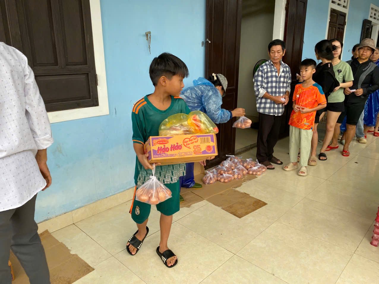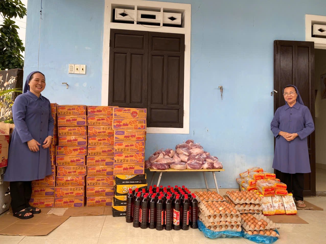 Với tấm lòng đầy nhiệt huyết, quý chị đã tìm đến thăm hỏi bà con lương – giáo trong vùng và gửi trao những phần quà thiết thực. Sáng ngày 30 tháng 10 năm 2025, nhờ sự hỗ trợ của các Ân – Thân nhân, quý chị tiếp tục trao tặng 50 suất quà cho các gia đình gặp khó khăn, gồm: mì tôm, thịt heo, trứng gà và bún khô.