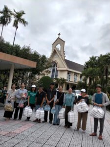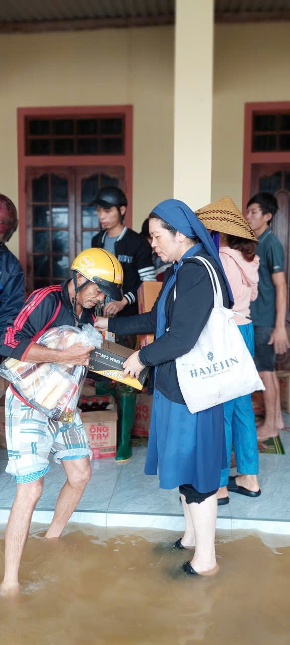 Giữa khung cảnh ấy, một số chị em cùng anh chị trong Hiệp Hội Tín Hữu Mến Thánh Giá Huế lại tiếp tục hành trình yêu thương. Hành trang của họ thật đơn sơ, nhưng chan chứa tình người – những phần quà nhỏ là hộp cơm, chai nước…, những lời thăm hỏi ân cần được gửi đến các gia đình vừa trải qua những ngày bị cô lập vì nước lũ.