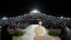 Các bạn thân mến, Đức Maria, Mẹ Thiên Chúa và là Mẹ chúng ta, tỏa sáng giữa tất cả các thánh như Đấng Chí Thánh. Nhiều người trẻ luôn mang theo một chuỗi Mân Côi, hoặc trong túi, trên cổ tay hoặc quanh cổ. Thật đẹp biết bao khi nhìn Chúa Giêsu qua đôi mắt của trái tim Đức Maria! Ngay cả từ nơi chúng ta đang đứng lúc này, thật ngọt ngào biết bao khi hướng ánh mắt lên Đức Mẹ Libăng với niềm hy vọng và tin tưởng!