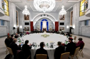 Thượng phụ Ignazio Efrem và Đức Thánh Cha tiến vào nhà thờ và cùng các vị lãnh đạo tôn giáo chụp ảnh lưu niệm; trong số này có một số vị đã hiện diện tại Iznik trong buổi lễ kỷ niệm 1700 năm Công đồng Nixêa vào ngày 29/11/2025.