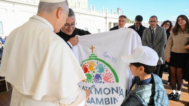 Khoảnh khắc xúc động nhất của buổi tiếp kiến diễn ra khi bé Majd Bernard, 7 tuổi đến từ dải Gaza – vùng đất đang chịu nhiều đau thương bởi xung đột – cùng với cha Enzo Fortunato, Chủ tịch Ủy ban Giáo hoàng về Ngày Thế giới Trẻ em, đệ trình lên Đức Thánh Cha lá cờ cùng với logo chính thức của Ngày Thế giới Trẻ em 2026. Đức Thánh Cha đã làm phép và ký tên lên lá cờ, biến nó thành biểu tượng thiêng liêng khởi đầu cho hành trình hướng về kỳ Đại hội năm tới.