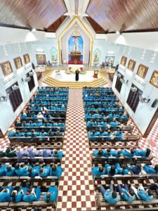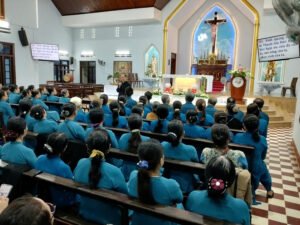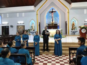 Đúng 9h, Cha Quản Hạt Antôn Nguyễn Văn Thăng chia sẻ với các hội viên về đề tài: Vai Trò Hội Viên Hiệp Hội Tín Hữu Mến Thánh Giá và hướng về Năm Thánh. Cha chia sẻ về cách Đấng sáng lập đến truyền giáo và thành lập Hiệp Hội. Cha nhấn mạnh đến tình yêu Thập giá, mỗi ngày theo Chúa chúng ta có rất nhiều cơ hội để vác thập giá đời mình, nếu chúng ta biết đón nhận với tình yêu mến thì thập giá sẽ trở nên nhẹ nhàng và là bông hoa thiêng liêng đẹp nhất dâng cho Chúa. Nhiều khi chúng ta chấp nhận vác thập giá đời mình, vác thập giá cho người thân, người bên cạnh, cho những người chúng làm việc và gặp gỡ, những cũng có những lúc chúng ta trao thập giá đời mình cho người khác vác. Kết thúc bài chia sẽ với bài hát “Thập Giá Nở Hoa”, Cha cất lên hát, các hội viên làm cử điệu theo. Trong Thánh Lễ bài giảng của Cha cũng giúp các hội viên sống đúng tinh thần Tin Mừng, biết lắng nghe và chia sẽ, người viên Mến Thánh Giá, yêu mến Thánh Giá và rao giảng Tin mừng qua đời sống cầu nguyện và lan toả yêu thương với những vùng, những nơi mình làm việc và ngay cả trong gia đình của mình.
