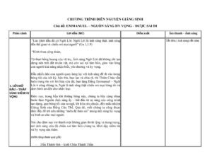 Giới Thiệu: Kịch Bản 7 – Diễn Nguyện Mừng Chúa Giáng Sinh 2024 KỊCH BẢN DIỄN NGUYỆN GIÁNG SINH NĂM 2024 Tác giả: Ane Lê Thùy Linh Hội dòng Mến Thánh Giá Huế Chủ đề: NIỀM HY VỌNG CỦA NHÂN LOẠI A. KHAI…