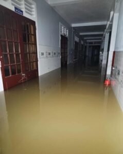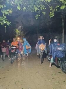 Chị Bề trên với vẻ mặt ưu tư, khoác áo mưa, đi khắp nhà xem xét tình hình. Chị cũng không ngại xắn tay áo dọn dẹp, chỗ nào khó là có chị. Chị Quản lý thì lo cất giữ lương thực cho thật an toàn. Các chị khác thì chia nhau dọn dẹp từ trường mẫu giáo đến trường khuyết tật. Riêng với các cháu cũng đi theo phụ các cô để dọn dẹp nhưng tôi thấy trên gương mặt các cháu không bạn nào cảm thấy mệt mỏi, nhưng đàng khác gương mặt các cháu hiện lên vẻ thích thú, tươi cười đùa giỡn với nhau, có vẻ như nó thích đi lội lụt, có em còn reo lên: “Cô ơi, ra ngoài đường coi lụt tới đâu rồi cô ơi!” Khi màn đêm buông xuống, chúng tôi mới tạm xong việc thu dọn. Tất cả đồ đạc đã được kê cao, hy vọng nước không dâng thêm nữa.