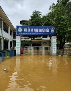 Chị Bề trên với vẻ mặt ưu tư, khoác áo mưa, đi khắp nhà xem xét tình hình. Chị cũng không ngại xắn tay áo dọn dẹp, chỗ nào khó là có chị. Chị Quản lý thì lo cất giữ lương thực cho thật an toàn. Các chị khác thì chia nhau dọn dẹp từ trường mẫu giáo đến trường khuyết tật. Riêng với các cháu cũng đi theo phụ các cô để dọn dẹp nhưng tôi thấy trên gương mặt các cháu không bạn nào cảm thấy mệt mỏi, nhưng đàng khác gương mặt các cháu hiện lên vẻ thích thú, tươi cười đùa giỡn với nhau, có vẻ như nó thích đi lội lụt, có em còn reo lên: “Cô ơi, ra ngoài đường coi lụt tới đâu rồi cô ơi!” Khi màn đêm buông xuống, chúng tôi mới tạm xong việc thu dọn. Tất cả đồ đạc đã được kê cao, hy vọng nước không dâng thêm nữa.