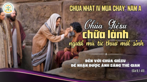 Bài Tin Mừng hôm nay đưa chủ đề ánh mắt và ánh sáng trong bài đọc 1 đến cực điểm qua câu chuyện Chúa Giêsu chữa người mù từ thuở mới sinh. Để hiểu ý nghĩa của câu chuyện, điều chúng ta cần làm là xem xét cấu trúc của bài Tin Mừng. Bài Tin Mừng được sắp xếp theo lối nghệ thuật kịch Hy Lạp và có cấu trúc như sau: Chữa lành người mù từ thuở mới sinh (9:1-12), những người Pharisêu chất vấn người mù đã được chữa lành và người mù làm chứng Chúa Giêsu là một ngôn sứ (9:13-17), người Do Thái chất vấn bố mẹ của người mù và họ sợ bị đuổi ra khỏi hội đường (9:18-23), cuộc tra khảo người mù lần thứ hai và đuổi anh ta ra khỏi hội đường (9:24-34), người mù tuyên xưng Chúa Giêsu là Con Người (9:35-38), sự đui mù của những người Pharisêu (9:39-41). Chúng ta cùng nhau rút ra những bài học từ những điểm khác nhau được trình bày trong cấu trúc của bài Tin Mừng.