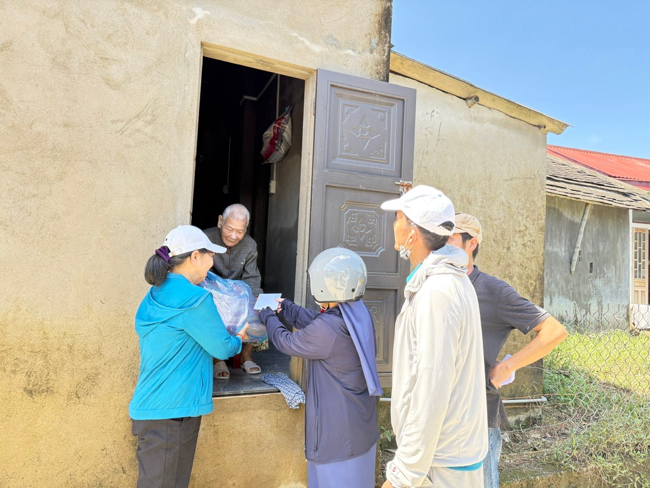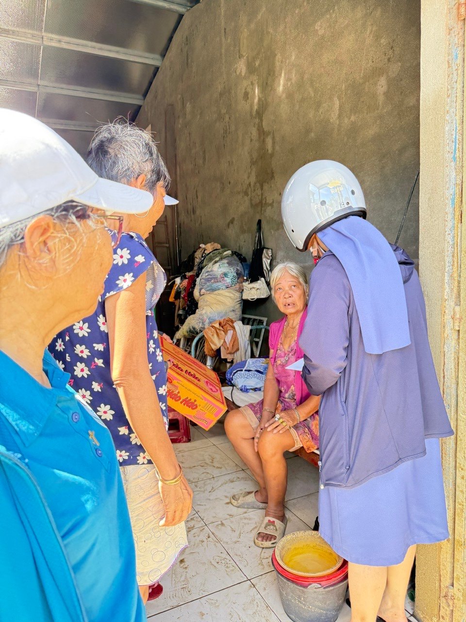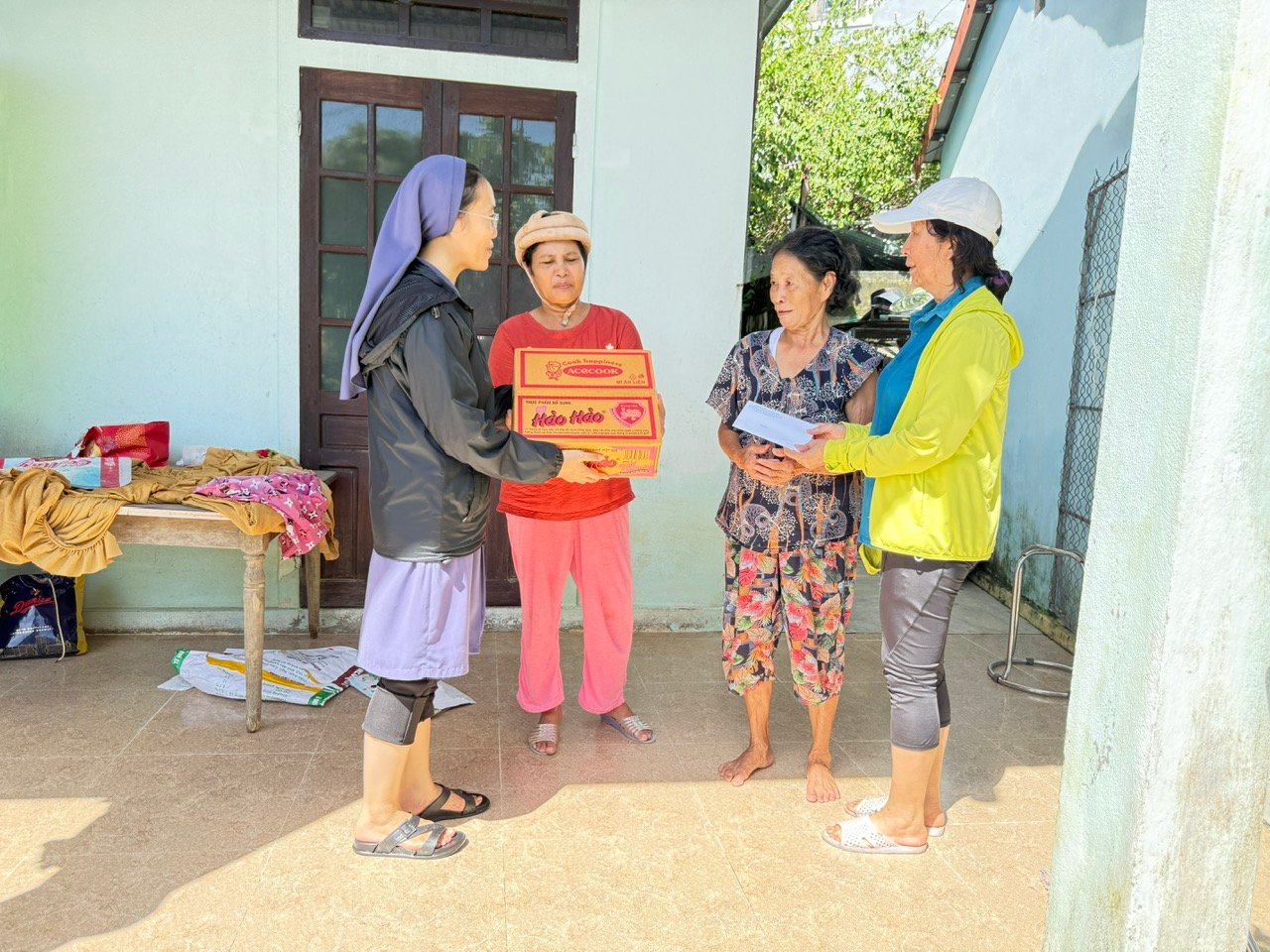 Nước đang rút dần ở những vùng trũng, và giao thông đã được lưu thông dễ dàng hơn. Chị em Mến Thánh Giá Huế cùng anh chị em Hiệp hội đã nhanh chóng đến với bà con ở Hương Sơ để chia sẻ và thăm hỏi họ. Trong chuyến đi này, quý chị đã thăm viếng các ông bà cao tuổi, những người neo đơn và bệnh tật.
