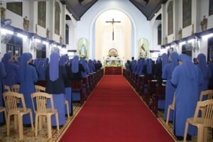 Tối 18/3, cùng với quý chị bề trên đang tham dự khóa Thường huấn, quý chị em trong các Cộng đoàn lớn nhỏ vùng Huế và Quảng Trị cùng anh chị em Hiệp hội Tín Hữu Mến Thánh Giá Huế đã hiện diện trong ngôi Nguyện đường để cùng tôn vinh, ca ngợi Thánh Giuse trong giờ tĩnh nguyện với chủ đề “Thánh Giuse – Con người của vùng ngoại biên”. Giờ tĩnh nguyện đào sâu về nhân đức, gương sáng của Cha Thánh, đồng thời cũng là những giây phút thiêng liêng để chị em cùng dâng lên Cha tâm tình yêu mến, tạ ơn của mình.