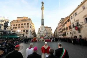 Lạy Đấng Vô Nhiễm Nguyên Tội, Mẹ của một đoàn dân trung thành, sự trong sáng của Mẹ soi sáng Rôma bằng ánh sáng vĩnh cửu, con đường của Mẹ tỏa hương thơm ngát trên các đường phố hơn cả những đóa hoa chúng con dâng lên Mẹ hôm nay. Lạy Đấng Vô Nhiễm Nguyên Tội, biết bao khách hành hương từ khắp nơi trên thế giới đã từng bước đi trên những con phố của thành phố này qua dòng lịch sử và trong Năm Thánh này. Một nhân loại đau khổ, đôi khi bị đè nặng, nhưng khiêm nhường như mảnh đất mà Thiên Chúa đã nhào nắn, và nơi đó Thánh Thần sự sống của Ngài luôn thổi vào.