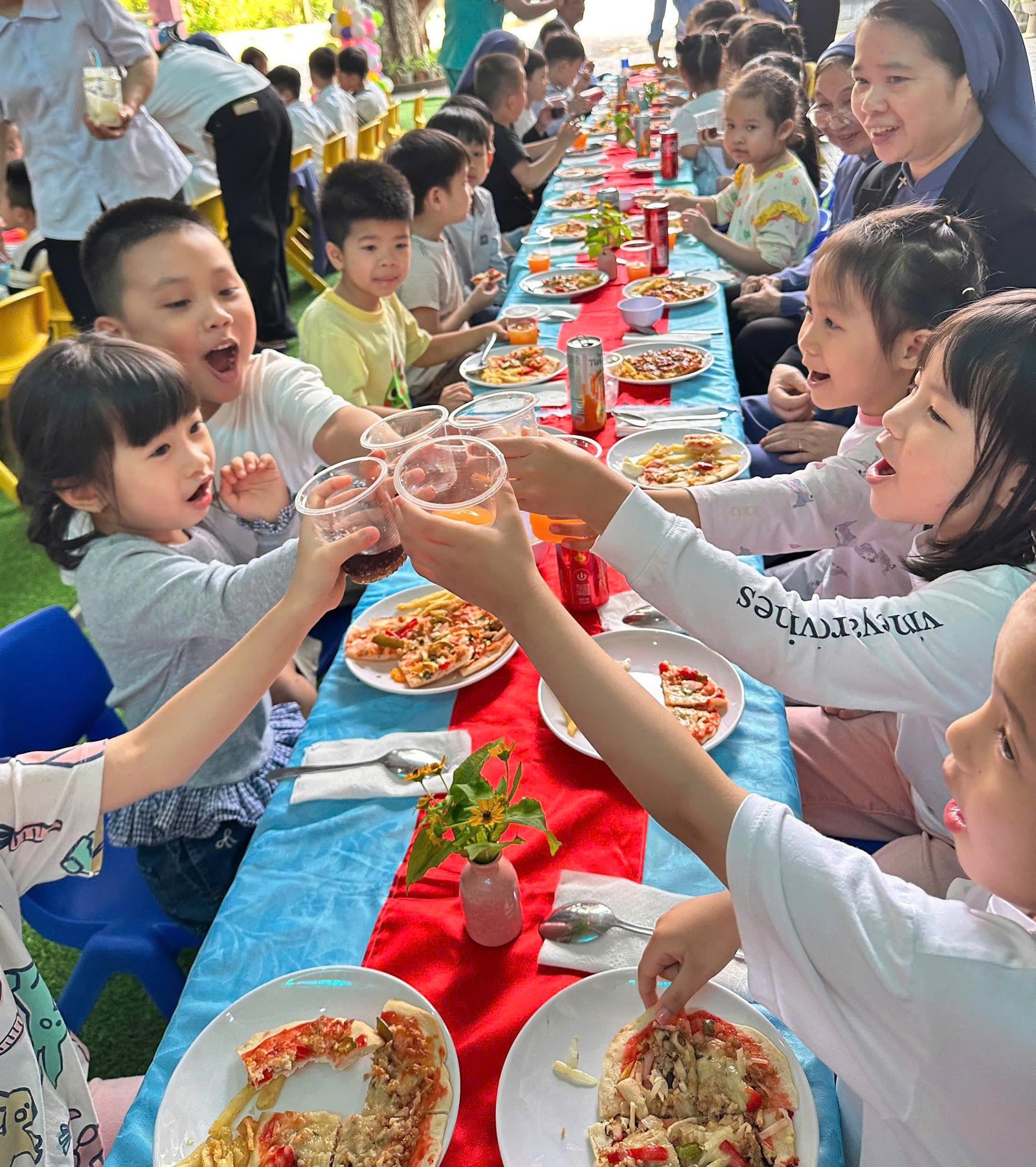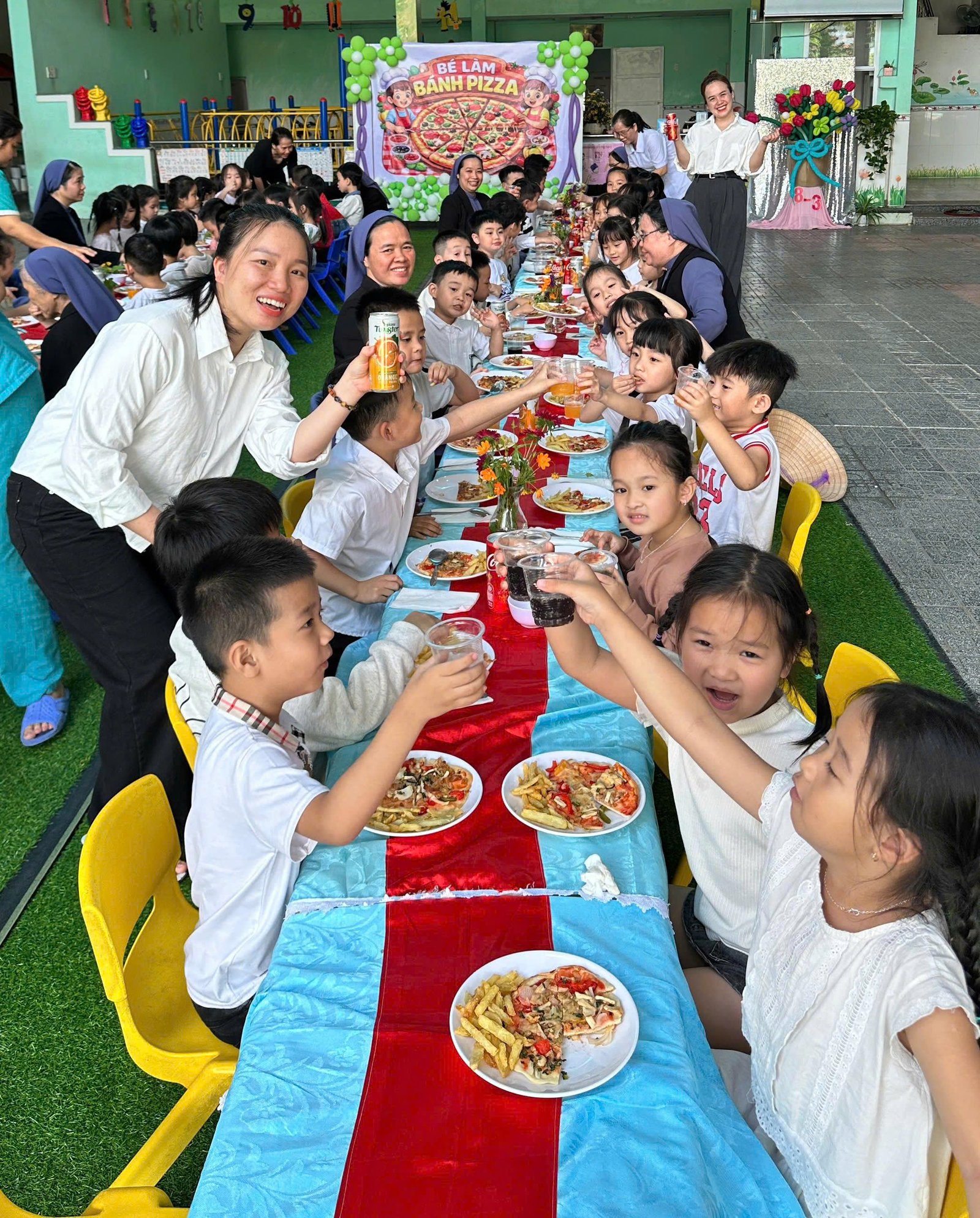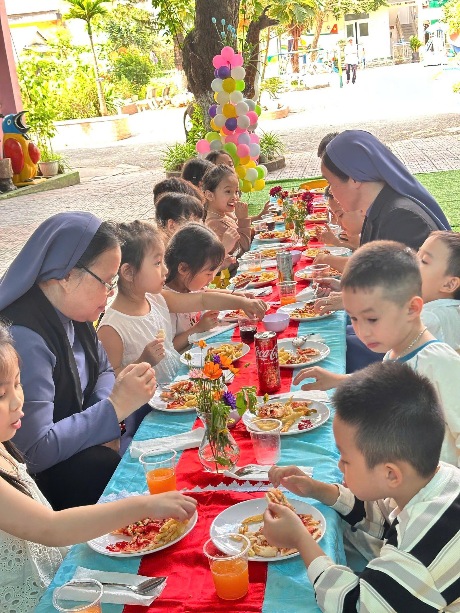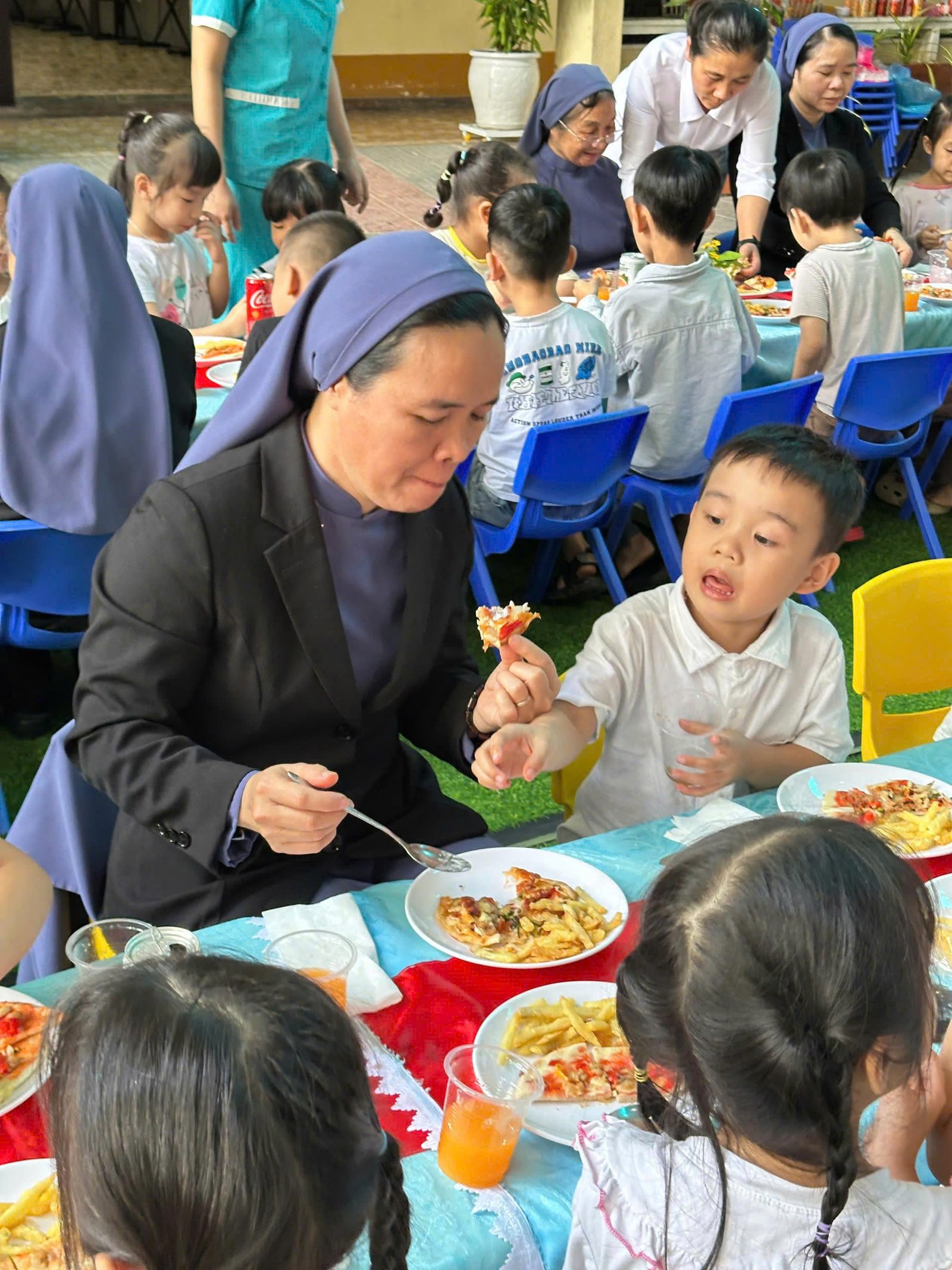 Niềm vui ấy được nhân lên cách đặc biệt qua sự hiện diện của quý bà và quý chị cộng đoàn Mến Thánh Giá Phủ Cam. Sự gần gũi, ân cần và sẻ chia của quý bà, quý chị trong từng khoảnh khắc cùng các em đã thể hiện rõ nét tinh thần đồng hành và trách nhiệm đối với sứ mạng giáo dục của cộng đoàn. Chính sự hiện diện đầy yêu thương ấy là nguồn động viên lớn lao, góp phần nuôi dưỡng và phát triển toàn diện cho các em nhỏ trong hành trình khôn lớn.