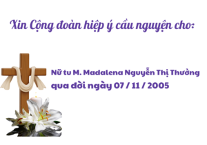Xin Cộng đoàn Hiệp Ý Cầu Nguyện Cho Quý Chị Có Lễ Giỗ Tháng 8 – Phần 1 Xin Chúa cho linh hồn quý Chị được hưởng hạnh phúc Thiên Đàng. Amen Chia sẻ mục này: Facebook Linkedin Pinterest Gmail